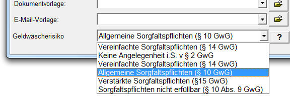Über Einstellungen / Stammdaten (Listen) / Geldwäscherisikostufen können die Kategorien auch abweichend konfiguriert werden.